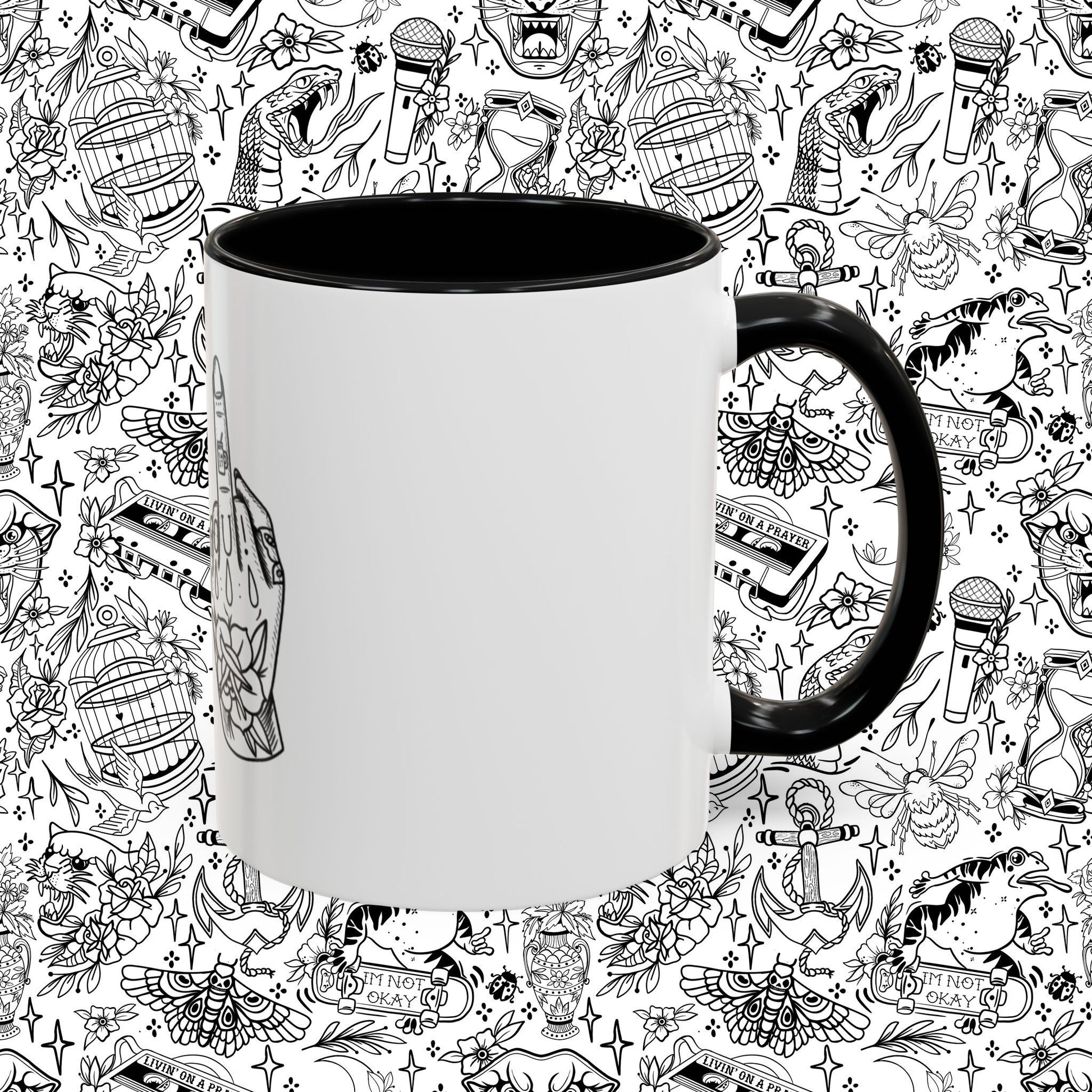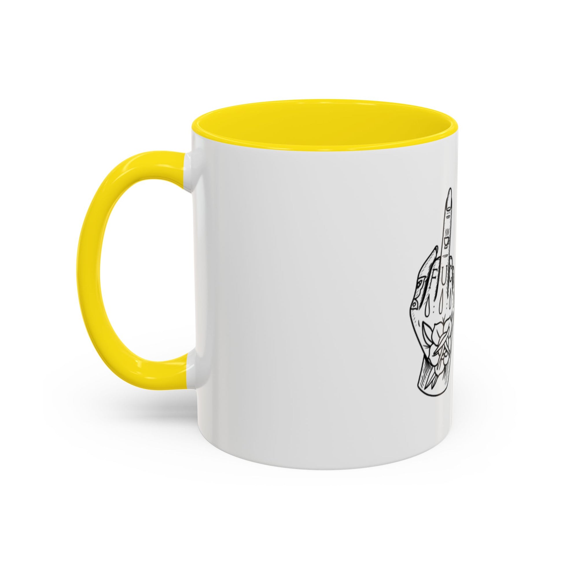 This bold ceramic mug carries an irreverent, tattoo-inspired design that speaks to people who favor punk attitude with handcrafted flair. The monochrome illustration of two inked hands flipping the bird is detailed and crisp, framed by a glossy white body and a colored interior and handle that add striking contrast. It’s the kind of mug you reach for when you want to make a statement — during a late-night design session, a noisy coffee break, or while kicking back with friends who get your sense of humor. Sturdy and bright, it keeps the artwork sharp through daily use and dishwasher cycles, so the attitude stays as loud as ever.