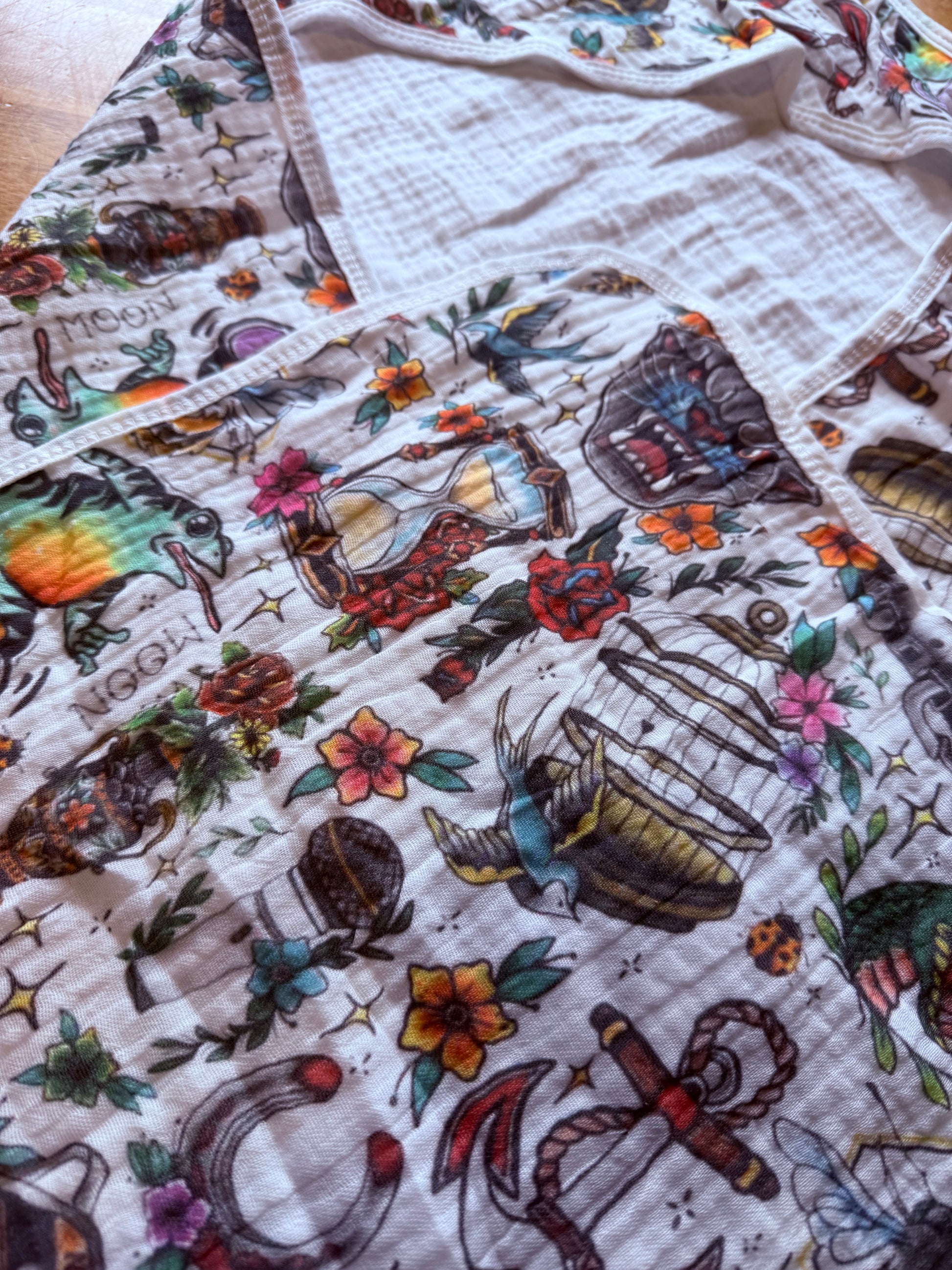 100% cotton, multi use blanket! I use mine for nursing with our tattoo style design on a large hooded muslin sheet